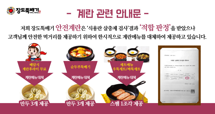 저희 장도뚝배기 안전계란은 ‘식용란 살충제 검사’결과 ‘적합 판정’을 받았으나 고객님께 안전한 먹거리를 제공하기 위하여 한시적으로 계란메뉴를 대체하여 제공하고 있습니다.