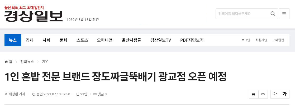 원본기사 바로가기 <<클릭 집밥 같은 푸짐함으로 자취생 등의 1인 가구들이 만족도 높은 한끼 식사를 할 수 있는 한식 브랜드 ‘장도짜글뚝배기’가 오는 7월 20일 수원광교점을 오픈할 예정이라고 밝혔다.한식 브랜드 ‘장...