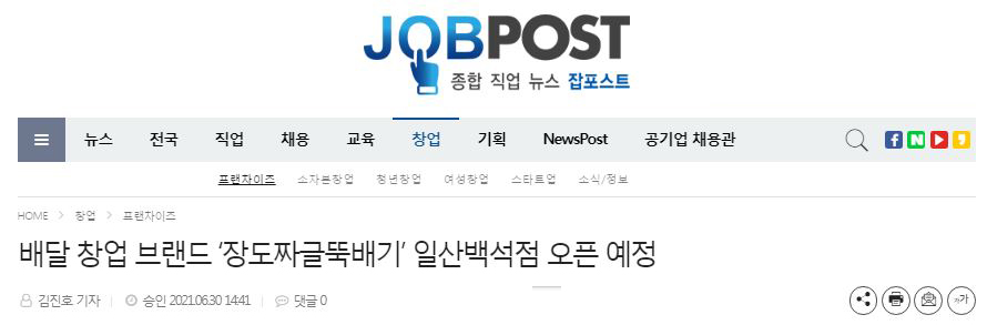 원본기사바로가기 << 클릭 [잡포스트] 김진호 기자 = 배달 및 주변 상권에 맞는 맞춤 창업 지원을 진행하는 배달 창업 브랜드 ‘장도짜글뚝배기’가 오는 7월 2일 일산 지역 가맹점 중 하나인 일산백석점을 오픈한다고 전했...